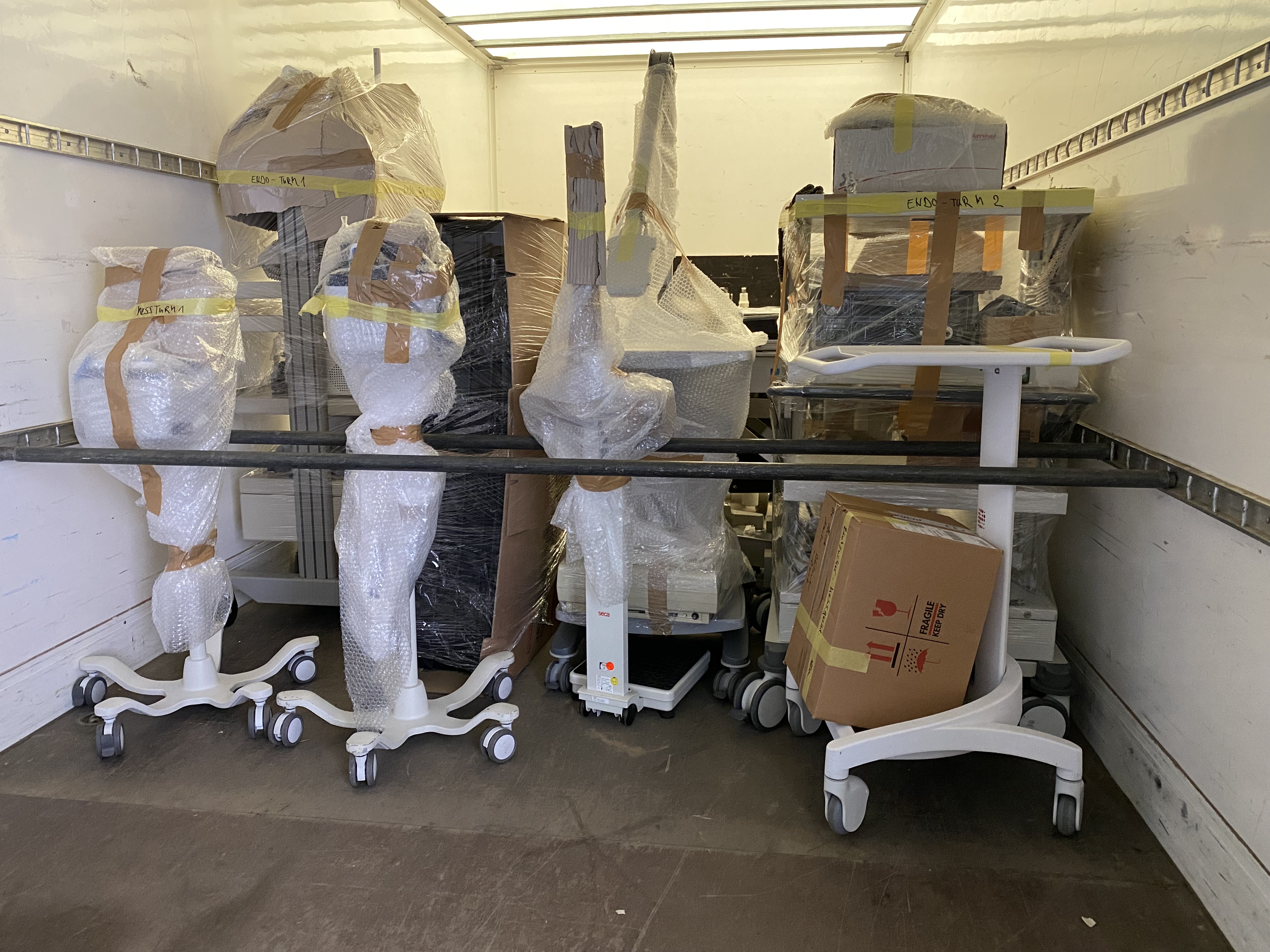 Bei der Abholung im Bürgerhospital Friedberg ist auch der Bad Nauheimer Alexander von Bischoffshausen mit dabei. Er hatte beim GZW nach überzähligen oder ausrangierten medizinischen Geräten gefragt und freute sich über die positive Resonanz. Gemeinsam mit Helfern verlud er eine Lungenfunktionskabine inkl. Zubehör, vier Therapieliegen, zwei Ultraschallgeräte, acht OP-Tische, drei EKG-Geräte, ein Ergometer, eine digitale Patientenwaage, eine OP-Lampe, mehrere Ohrthermometer und diverses Verbrauchsmaterial auf den Lkw.